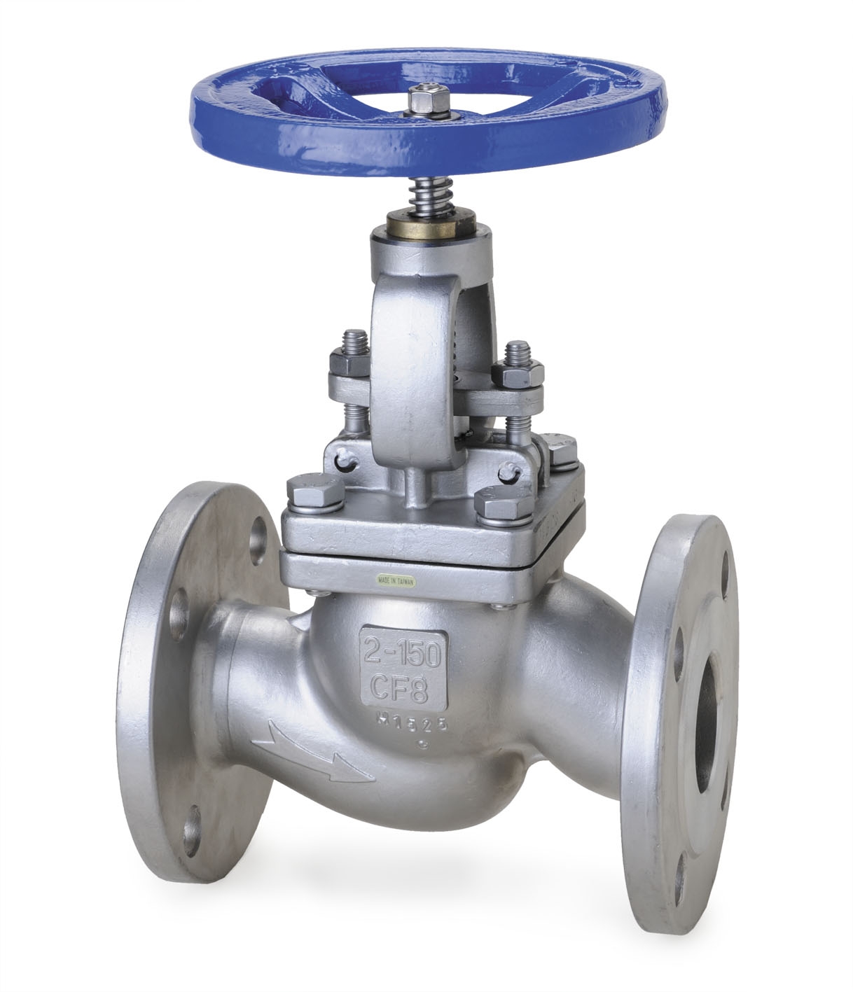 ![]() | Globe ValveA globe valve generally has a spherical body that contains a movable plug element and a stationary ring seat. The two halves of the body are separated by an internal baffle. The plug element is connected to an operating hand wheel through a stem. As the wheel is turned, the screw action moves the plug towards or away from the ring seat. Globe valves can be used for stop/start function as well as to regulate fluid flow. They are useful in applications where good flow control is desired and leak tightness is important such as cooling water systems, feedwater and chemical feed systems, and fuel/lubricating oil systems. |
